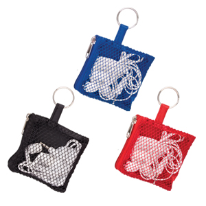 BOLSA DE MALLA TIPO LLAVERO. INCLUYE: AUDÍFONOS Y PAÑO. COLORES: AZUL/ NEGRO / ROJO.